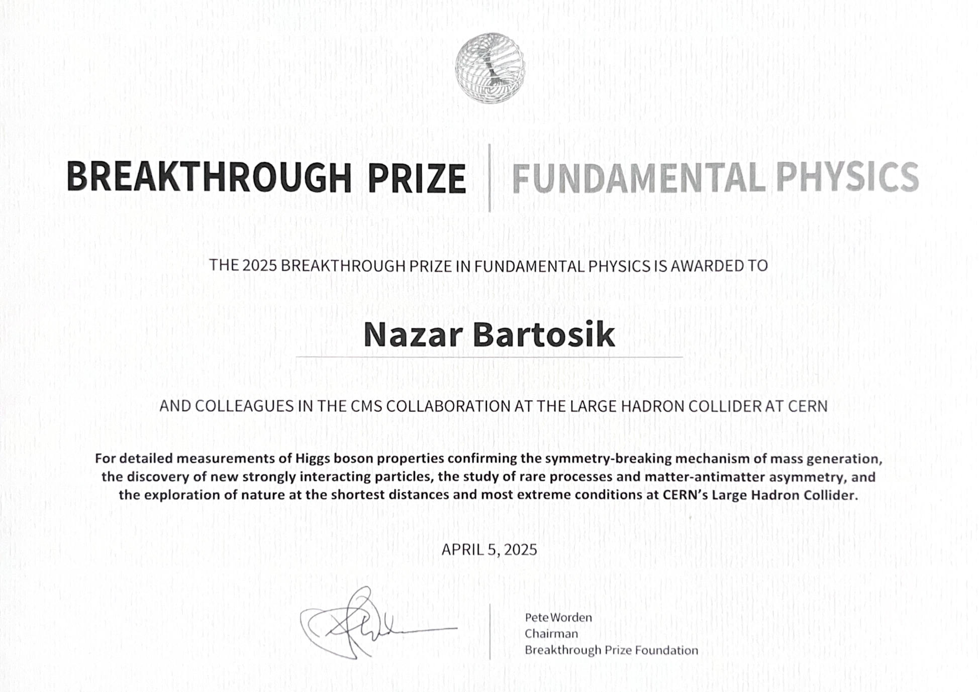 Breakthrough Prize (certificate and a photo of me with the trophy) for the contribution to the measurement of the Higgs-boson properties (issued to every member of the CMS collaboration)