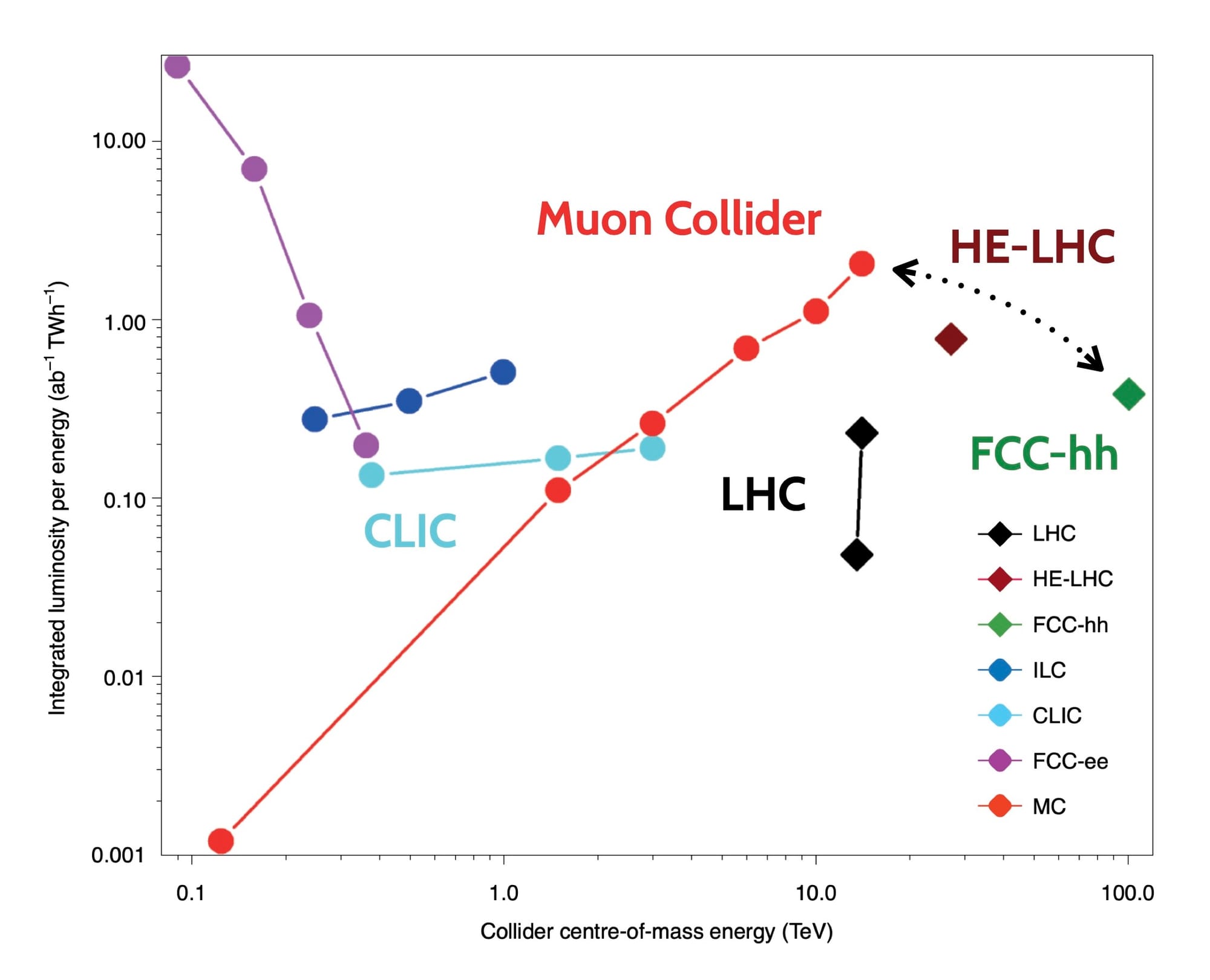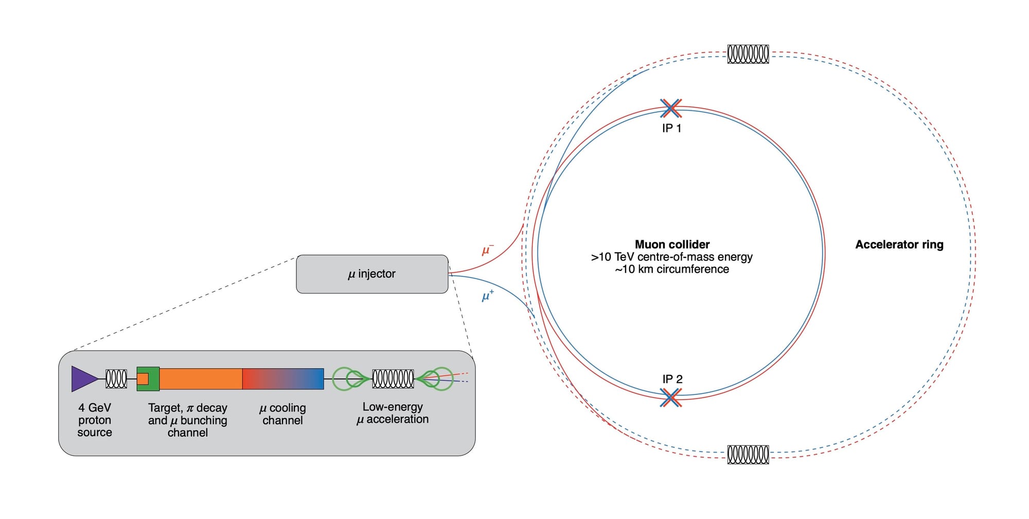 Instead, muons combine the best of the two worlds – they are point-like particles, like electrons, but they are x200 heavier and therefore lose x10000 less energy through synchrotron radiation. This allows to accelerate them in a ring to extremely high speeds, while bringing all that energy into the actual collision.