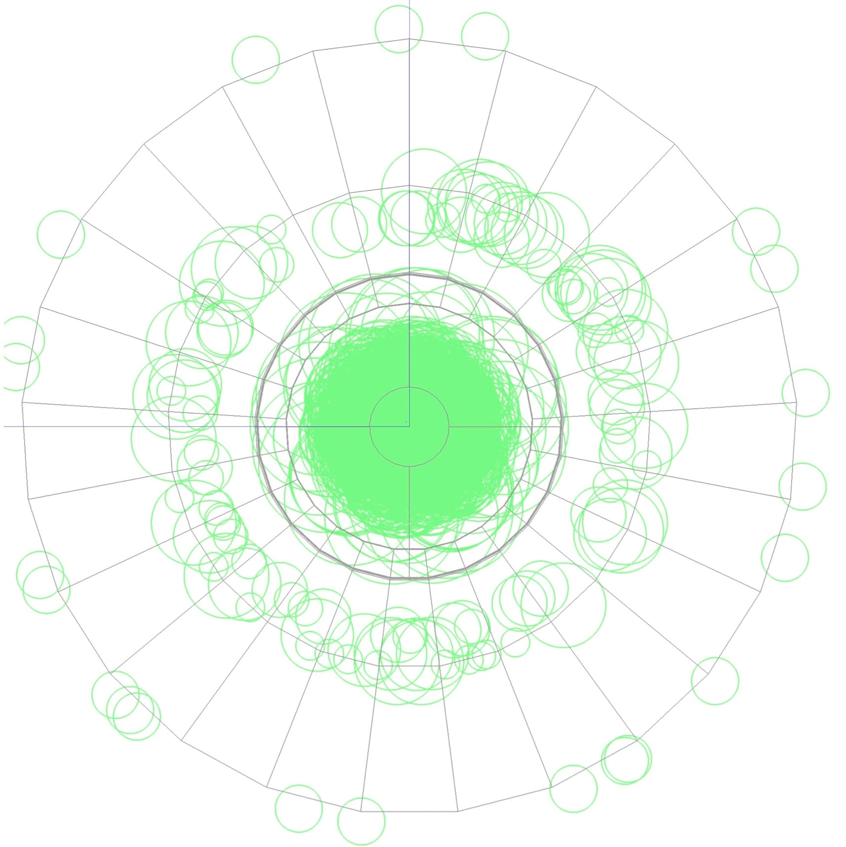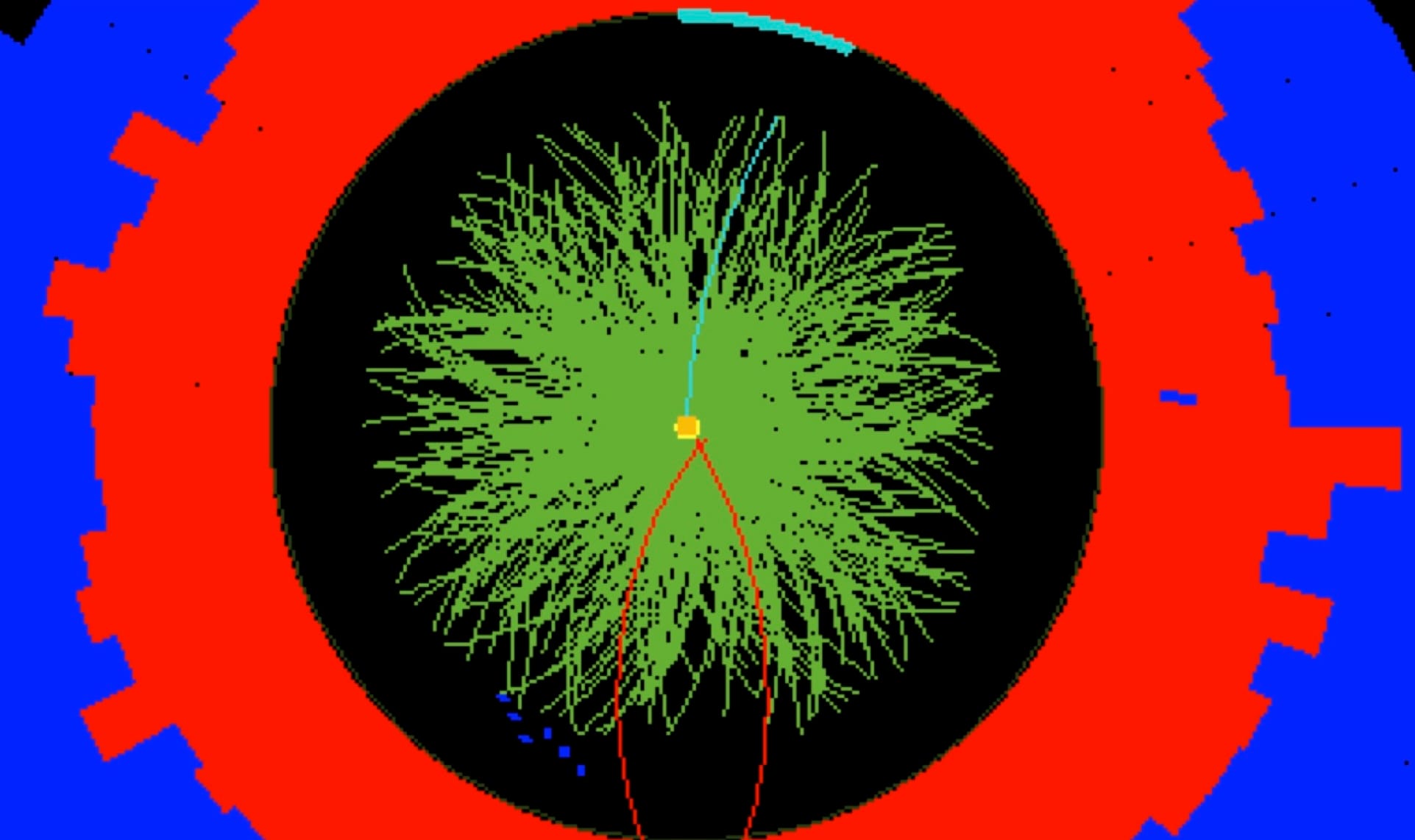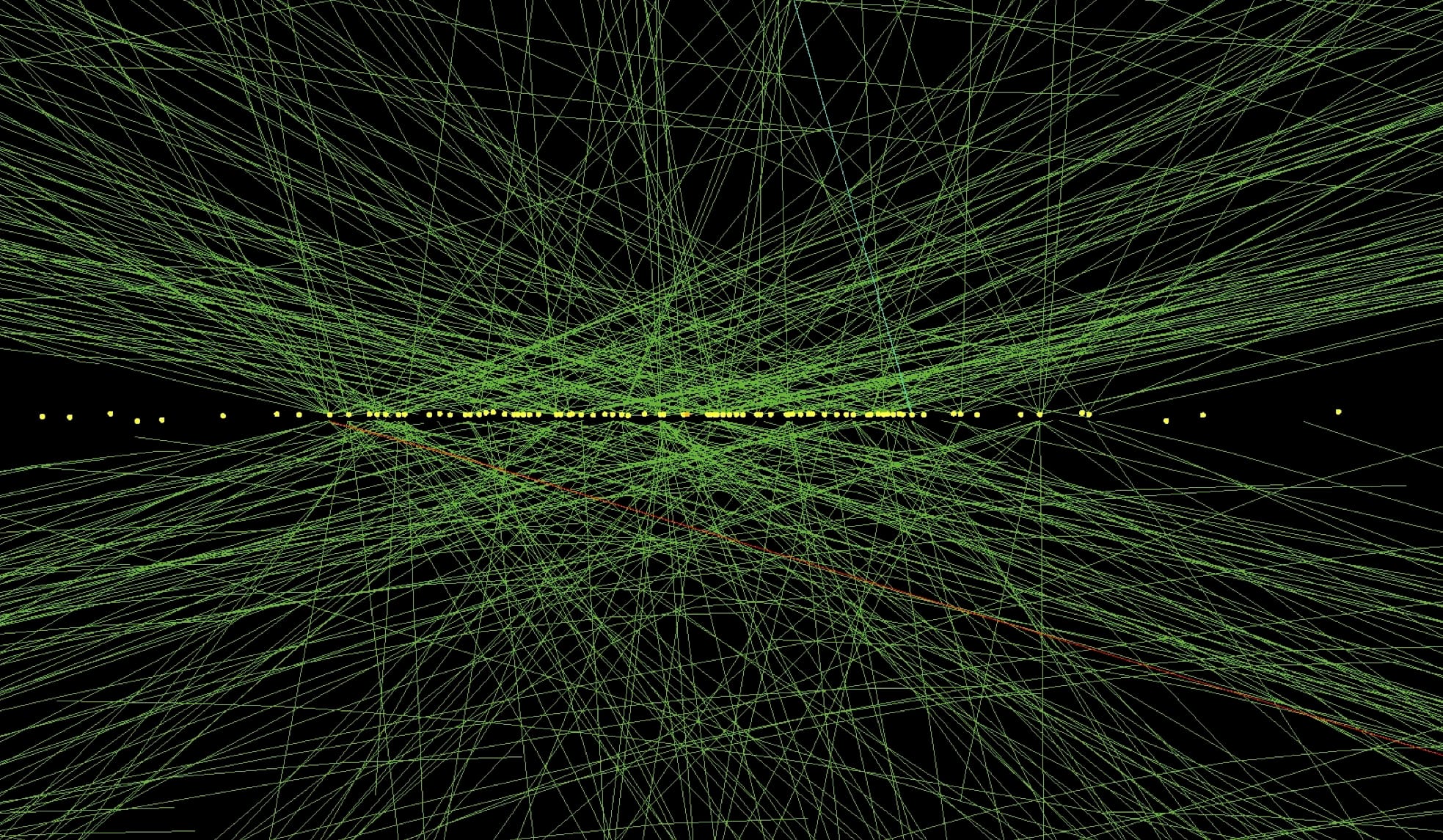 Yellow dots showing the positions of multiple pile-up collisions at the LHC, from which energetic particles originate