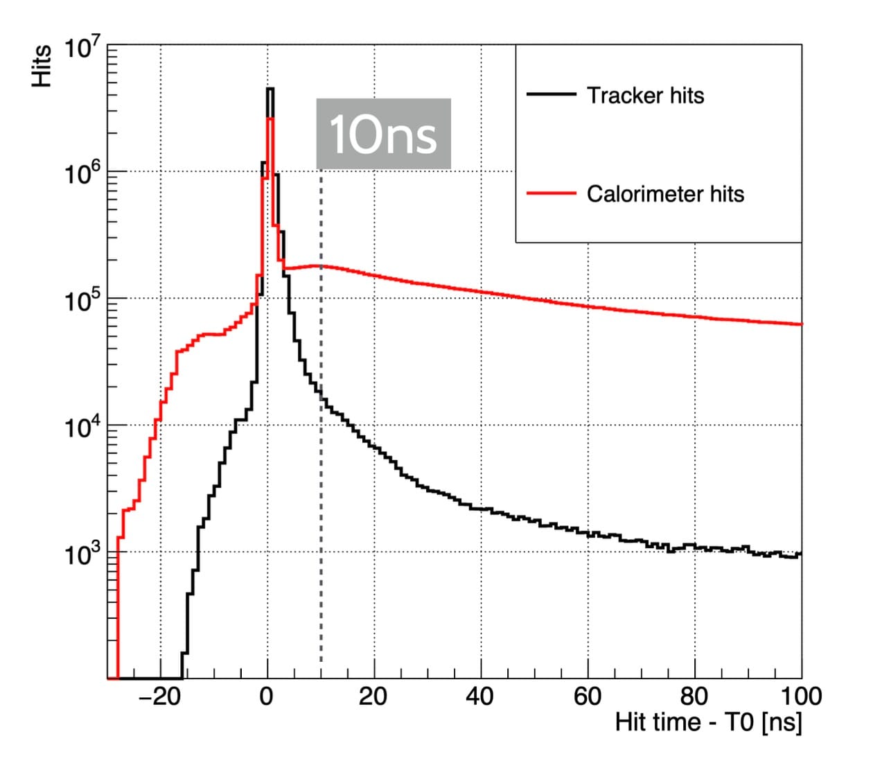 The first relevant aspect of the experiment is the time it takes for the background particles to arrive to the detector. Unlike the LHC, where background particles arrive synchronously with the signal, at the Muon Collider they come from the muons decaying at various locations along the beam, taking trajectories of different lengths. As a result, their arrival time in the detector is spread across several milliseconds, in contrast to signal particles that arrive within just few nanoseconds (ns) from the main collision – a million times shorter time window. Besides, the detector itself needs no more than 10 ns to integrate its signal and to do the measurements, being completely unaffected by any particles reaching it later, except for the radiation damage that it will slowly accumulate.