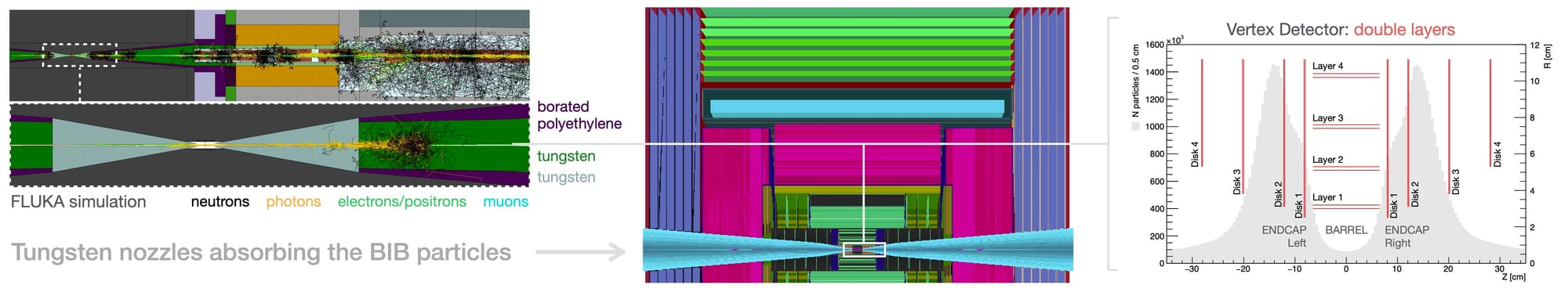 Muon Collider is no exception, and our group has been working on such simulation studies since 2018. Over the time we've built a software framework for detailed simulation of the experiment to evaluate different detector layouts, sensor technologies, computing algorithms, etc.