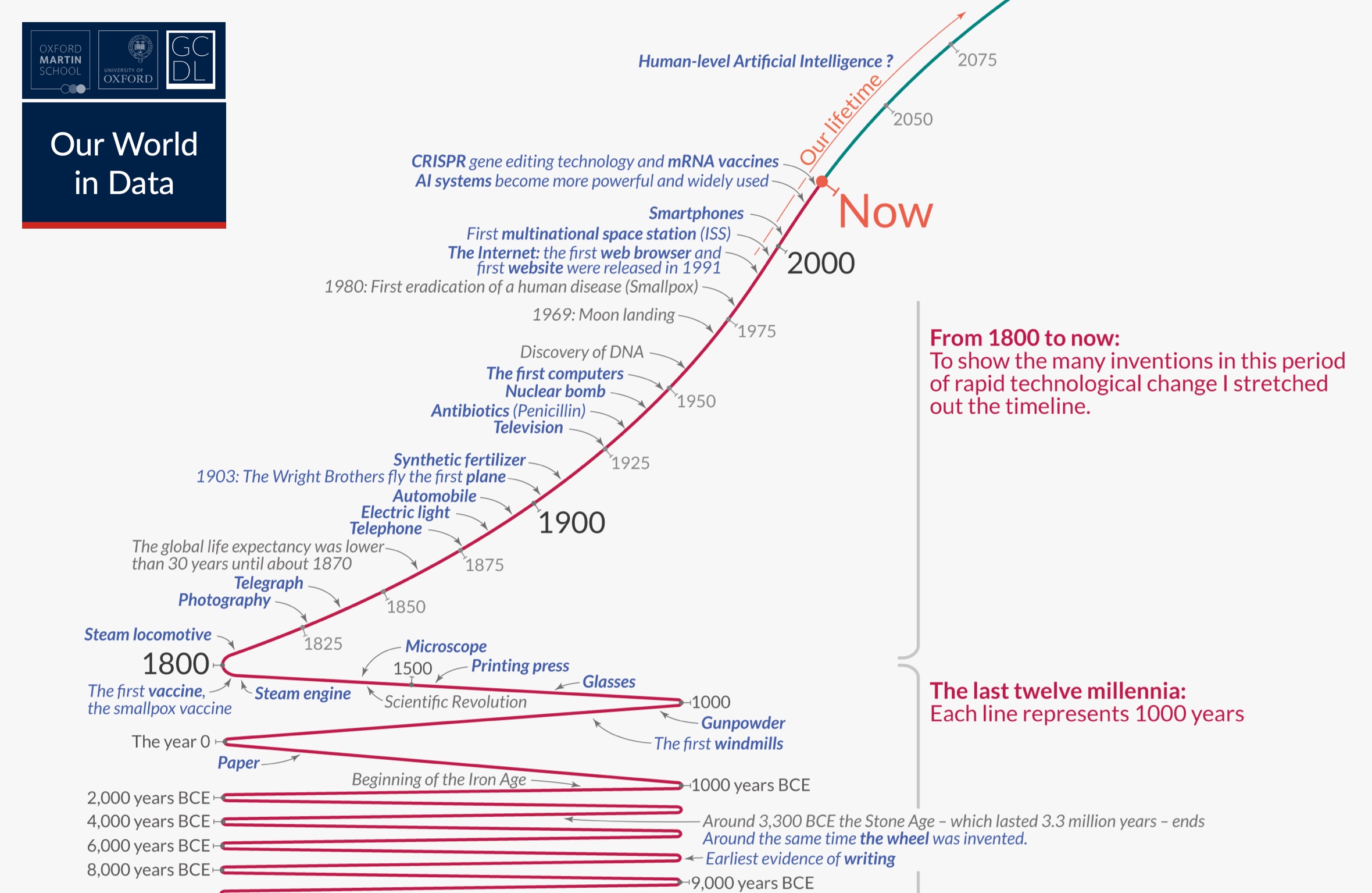 If you look at the timeline of technological progress of our civilization, it shows a tremendous exponential growth over the last 200 years, which is just a flash next to the 200,000-year-long history of the Homo sapiens species, who had started with no more than rocks and fire.